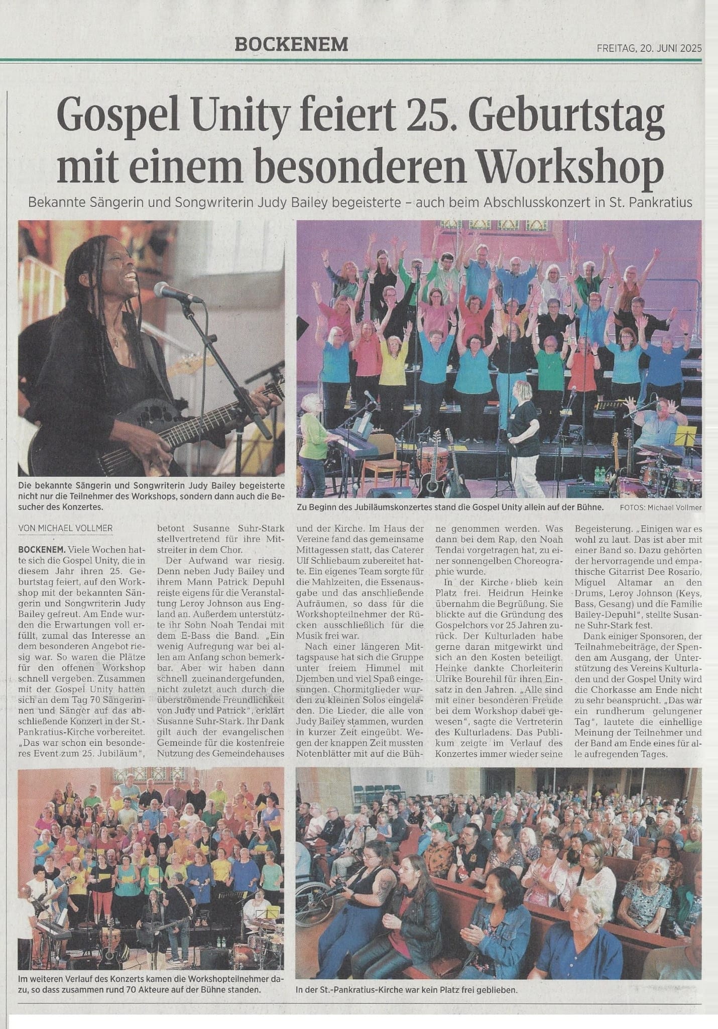 BOCKENEM. Viele Wochen hatte sich die Gospel Unity, die in diesem Jahr ihren 25. Geburtstag feiert auf den Workshop mit der bekannten Sängerin und Songwriterin Judy Bailey gefreut. Am Ende wurden die Erwartungen voll erfüllt.
